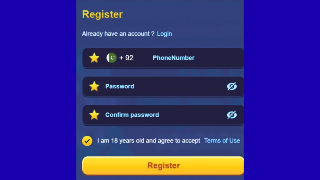 You tap register, enter your number, set a password, and submit.